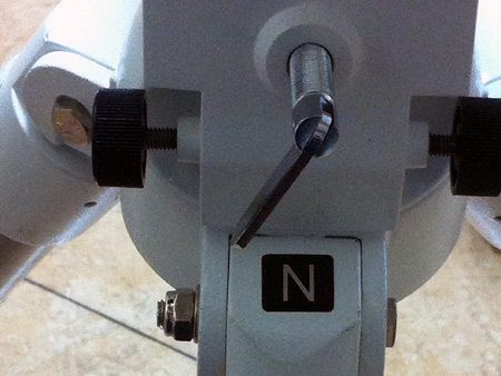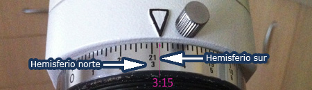 Movemos el eje AR hasta que las 03:15 del anillo graduado, coincida con la marca en forma de triángulo de la montura. Si la graduación del anillo no es muy precisa, podemos esperar a que sea una hora en punto o medias horas. En la mayoría de las monturas ecuatoriales este anillo muestra dos líneas de horas; una debajo de la otra. Es necesario determinar cuál de las líneas se corresponde con el hemisferio terrestre que nos encontramos.