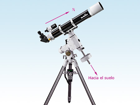 Colocamos la montura en el trípode, liberamos los embragues y la dejamos en la posición HOME. En esta posición el telescopio quedaría mirando hacia el PNC y la barra de contrapesos mirando hacia el suelo y en línea con la pata norte. Actuando sobre el eje de AR, hay que intentar dejar esta barra lo más directamente posible mirando al suelo
