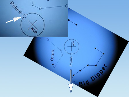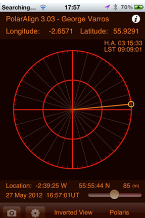 El paso siguiente es saber cuánto tiempo hace que la estrella polar (Polaris) pasó por el Meridiano Superior del lugar. El mando de cualquier montura con sistema GoTo nos dará este dato; por ejemplo: HA=03:15 [Hour Angle=03:15]. También podemos obtenerlo de cualquier programa planetario como "Cartes du Ciel" (ángulo Horario), The Sky, etc., o por medio del Polar Finder Scope, un software para tal efecto. También existen aplicaciones para smart phone que proporcionan este dato, como PolarAling o AstroKid